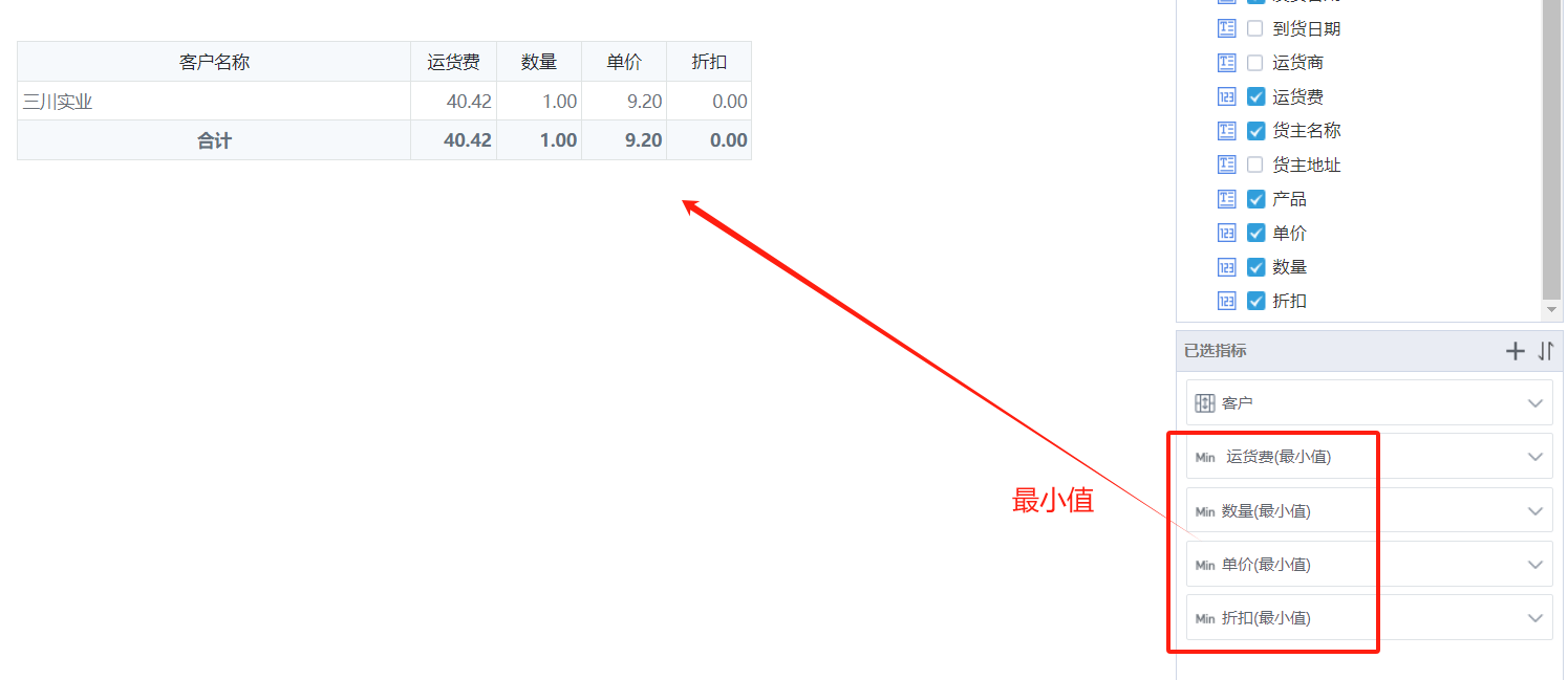 最小值是在进行合并相同值的情况下,对数据进行求最小值,例如:已知三川实业一共有11个订单,则统计这11条数据中的订单数量、运费、单价、折扣最小值。
