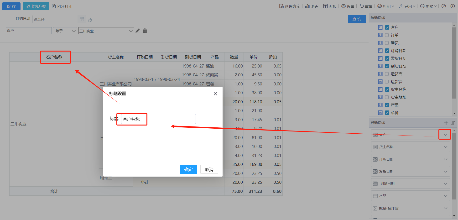 除了设计人员在设计器中更改指标名称,业务人员可根据实际情况显示不同的标题名称。