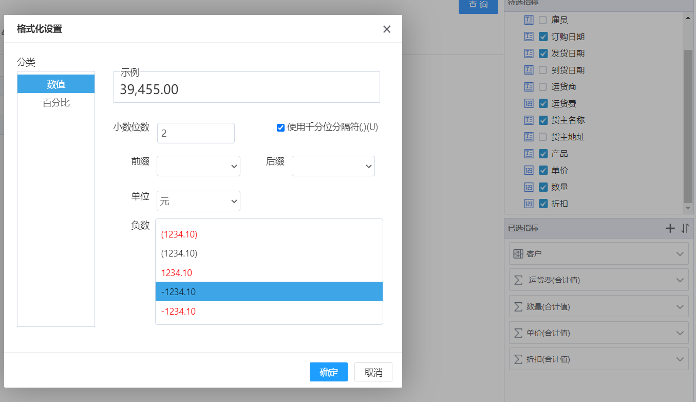 负数:负数主要是设置数据为负数时的展示样式,如设置负数样式为“-1234.10”,那么当有数据为负数时则显示为红色。
