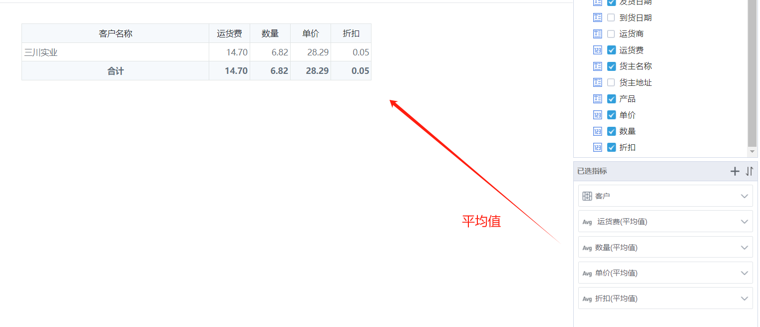 平均值是在进行合并相同值的情况下,对数据进行求平均,例如:已知三川实业一共有11个订单,则统计这11条数据中的订单数量、运费、单价、折扣平均值。