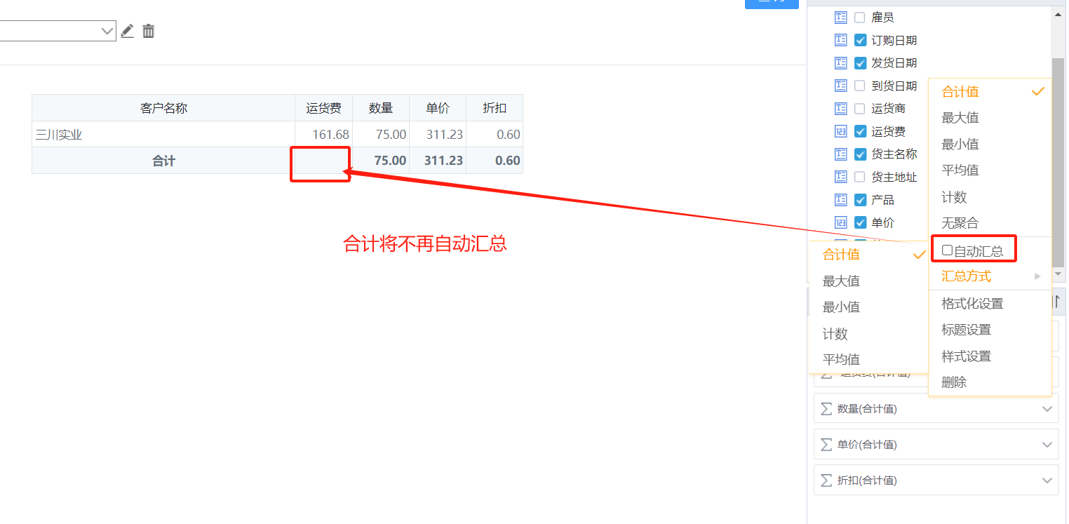 选择自动汇总选项,报表展示能够把当前的所有小计和合计值进行统计处理。同时可以根据选择不同的汇总方式进行合计统计。