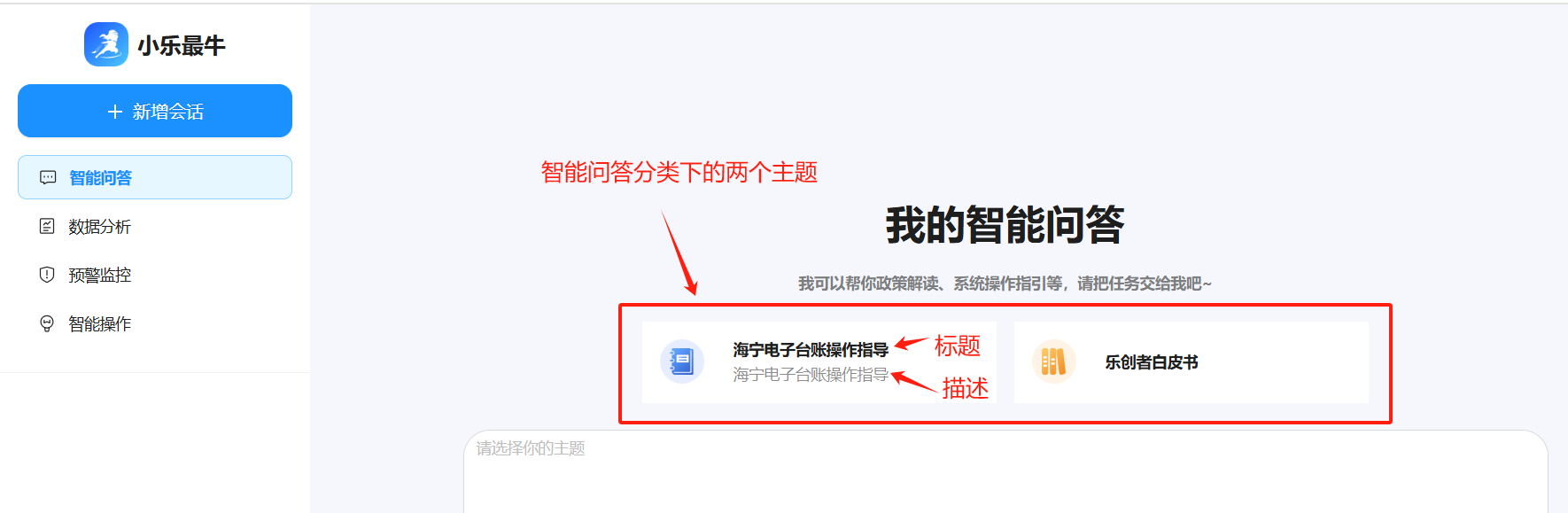 左边区域“智能问答”、“数据分析”、“预警监控”、“智能操作”,这些称为主题分类,如下图: