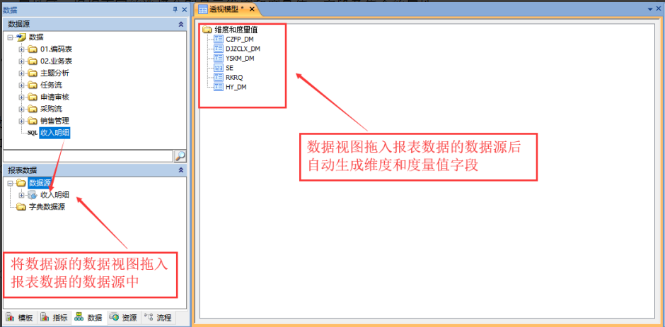 透视模型中的数据源为透视模型提供了业务数据,业务数据字段作为维度和度量值的字段。将“数据源”中的数据视图拖入“报表数据”的数据源中,作为透视模型的事实数据源,如下图:
