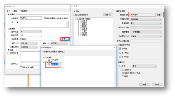 在“资源”选项卡中双击自动创建的参数,在参数设置界面设置参数显示类型为“树”,点击报表数据后的“设置”按钮,选择报表数据中的字典数据“财政分片”为参数的数据源,如下图: