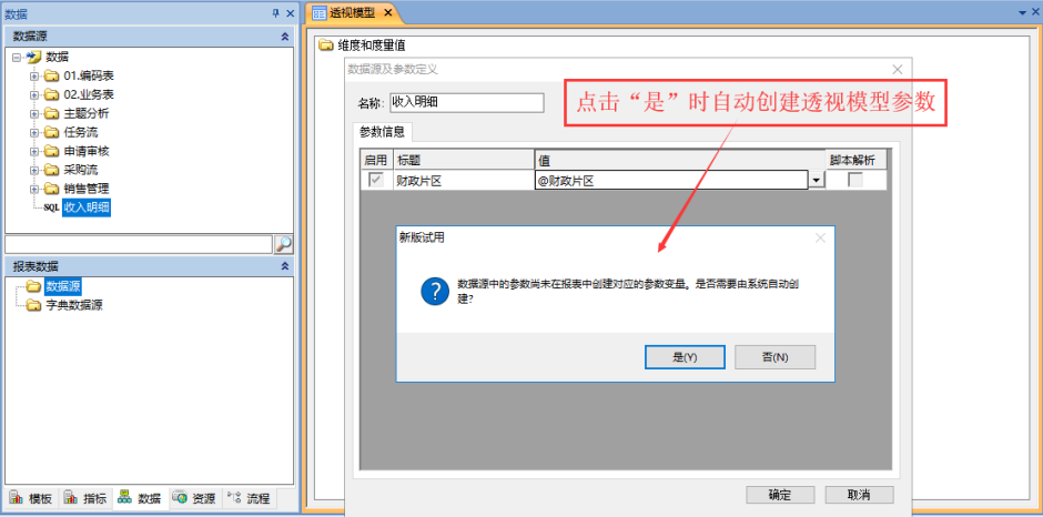 将数据源中的数据视图拖入报表数据的数据源时,如果数据视图存在参数,会询问是否创建报表参数,点击“是”可以自动创建参数。如下图:
