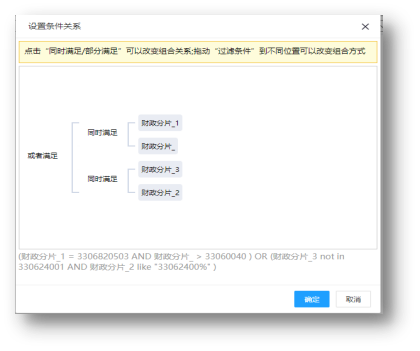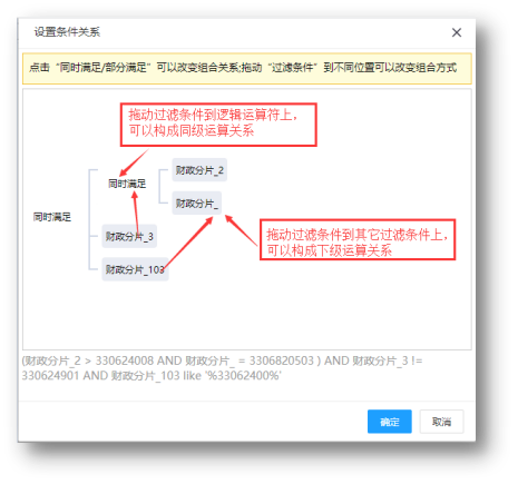 在条件逻辑关系设置界面拖动“过滤条件”到不同的位置上改变条件的组合方式,如下图: