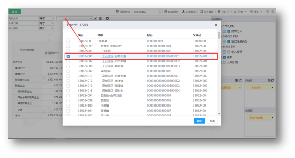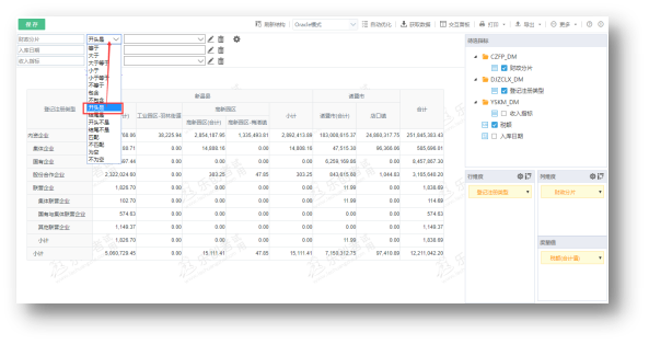 例如上图,定义了“财政分片”、“入库日期”和“收入指标”三个过滤条件,其中“入库日期”是一个字段,可以在输入框控件中输入需要的条件。“财政分片”和“收入指标”是维度集合,可以选择维度成员作为过滤条件,如下图: