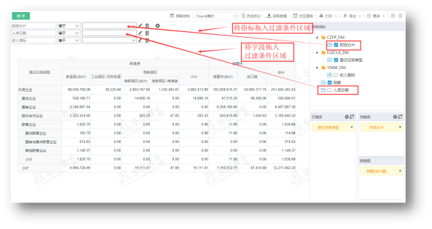 将字段或维度指标拖到条件设置区域,作为报表的过滤条件,如下图: