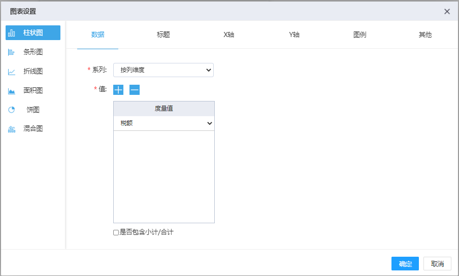 “数据”中可以配置图表数据的取数来源,图表的“系列”默认为“列维度”,“值”默认为第一个度量值。如果需要将小计的数据也在图表中显示,可以勾选“是否包含小计/合计”。
