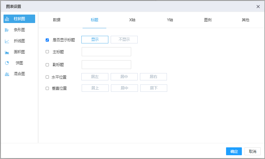 “标题”中包含“是否显示标题”、“主标题”、“副标题”和标题的显示位置配置。这些配置都有默认值,不配置时根据默认值显示。如果需要自定义图表标题和显示方式,先要勾选功能前面的“复选框”,启用功能配置。