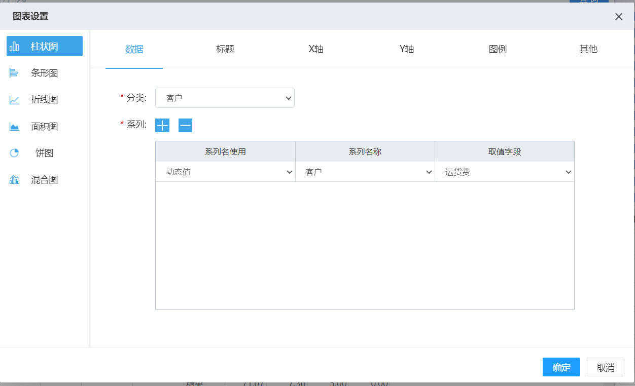 图表设置界面分为左右两个区域,左边是图表类型选择区域,右边是图表对应功能设置区域,根据选的图表类型出现不同的功能配置。图表类型默认“柱状图”,可自行修改图表类型。以下以“柱状图”为例了解图表的具体设置。