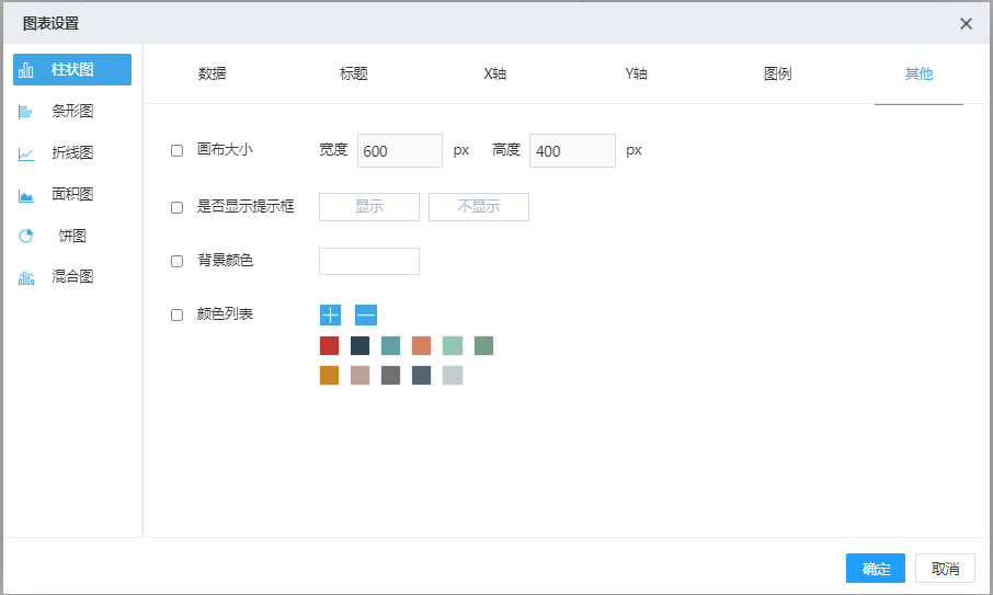 图表的“其它”选项配置中可以配置图表的“画布大小”、“是否显示提示框”、“背景颜色”和“颜色列表”。