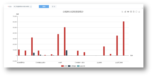 图表指标的模板是图表,通过图表配置实现报告中图表的展示。如某企业要分税种、分税务类型统计,并形成柱状图,最终显示如下图: