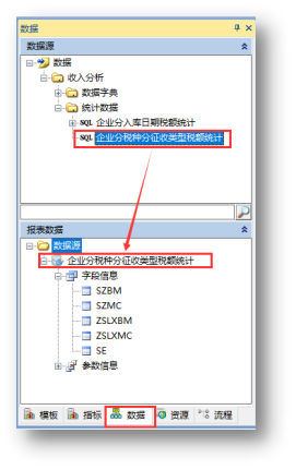 在“数据”选项卡中将“数据源”中的数据视图拖入图表指标中的,如将“数据源”中的“企业分税种分征收类型税额统计”拖入指标的“数据源”中,如下图: