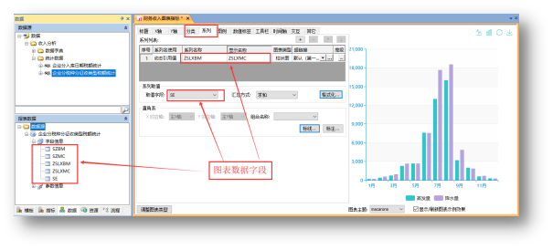 将拖入的“数据视图”作为图表的数据来源,图表“分类”和“系列”设置时显示图表数据的字段。如下图: