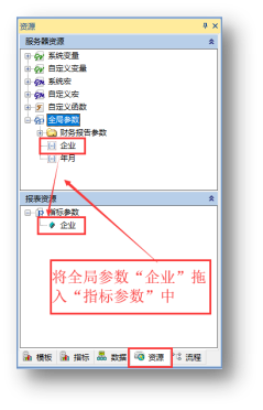 图表指标的参数来源于全局参数,在“资源”选项卡中可以将全局参数拖入到“指标参数”中。如:将“企业”从全局参数拖入指标的“指标参数”中,如下图: