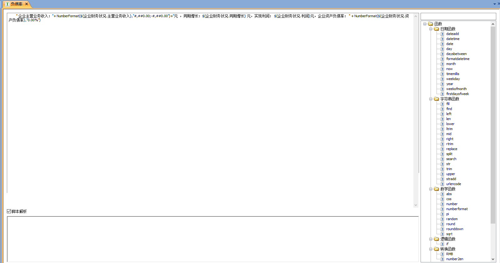 文本指标解析就是将文本被翻译成结果文字的过程。文本指标支持脚本解析,如果不勾选“脚本解析”,那么文本被翻译只需要经过一个“文本替换”过程即可:如下图: