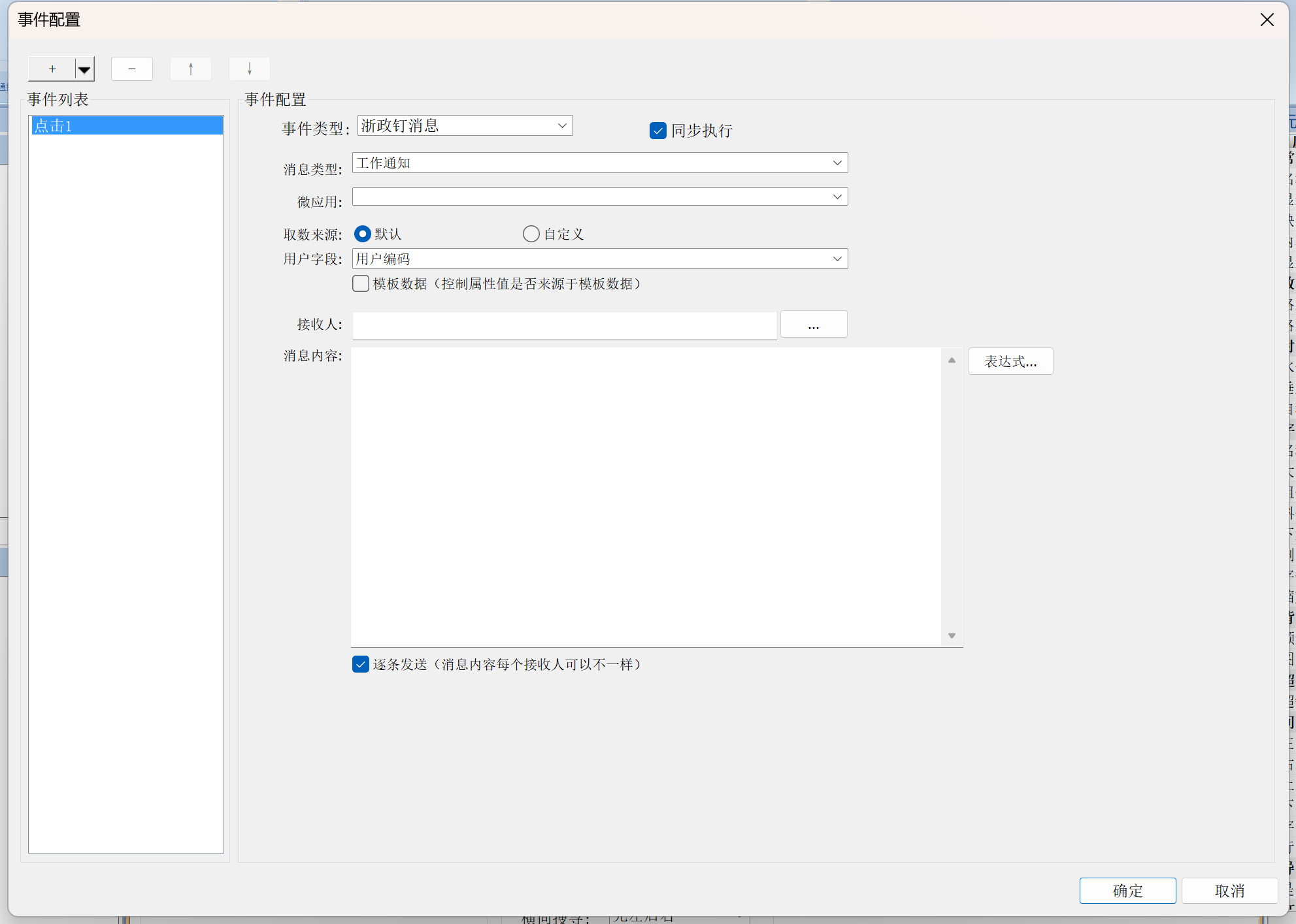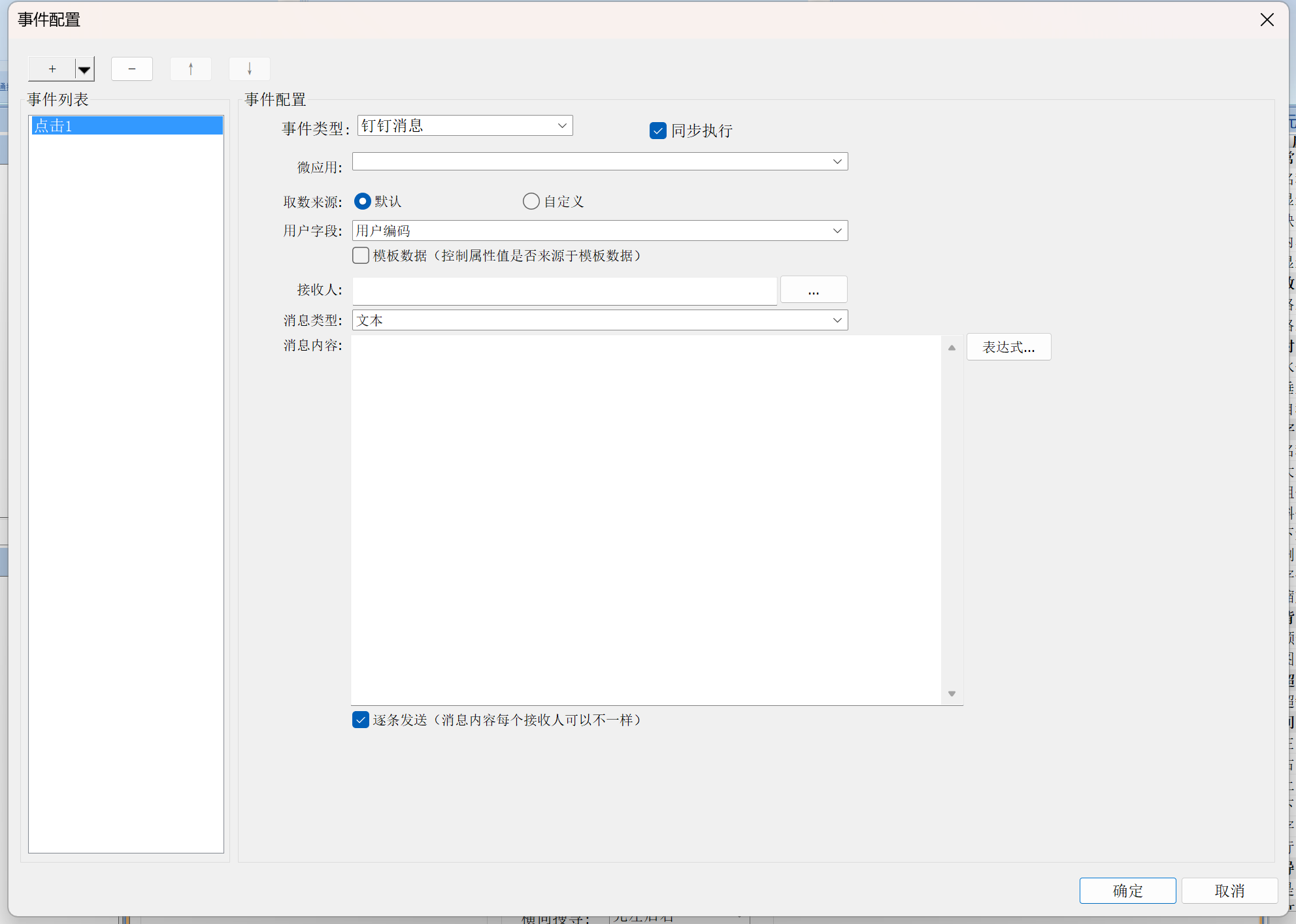支持选择配置的钉钉微应用,接收人及消息内容(设置详细介绍参见:钉钉消息)