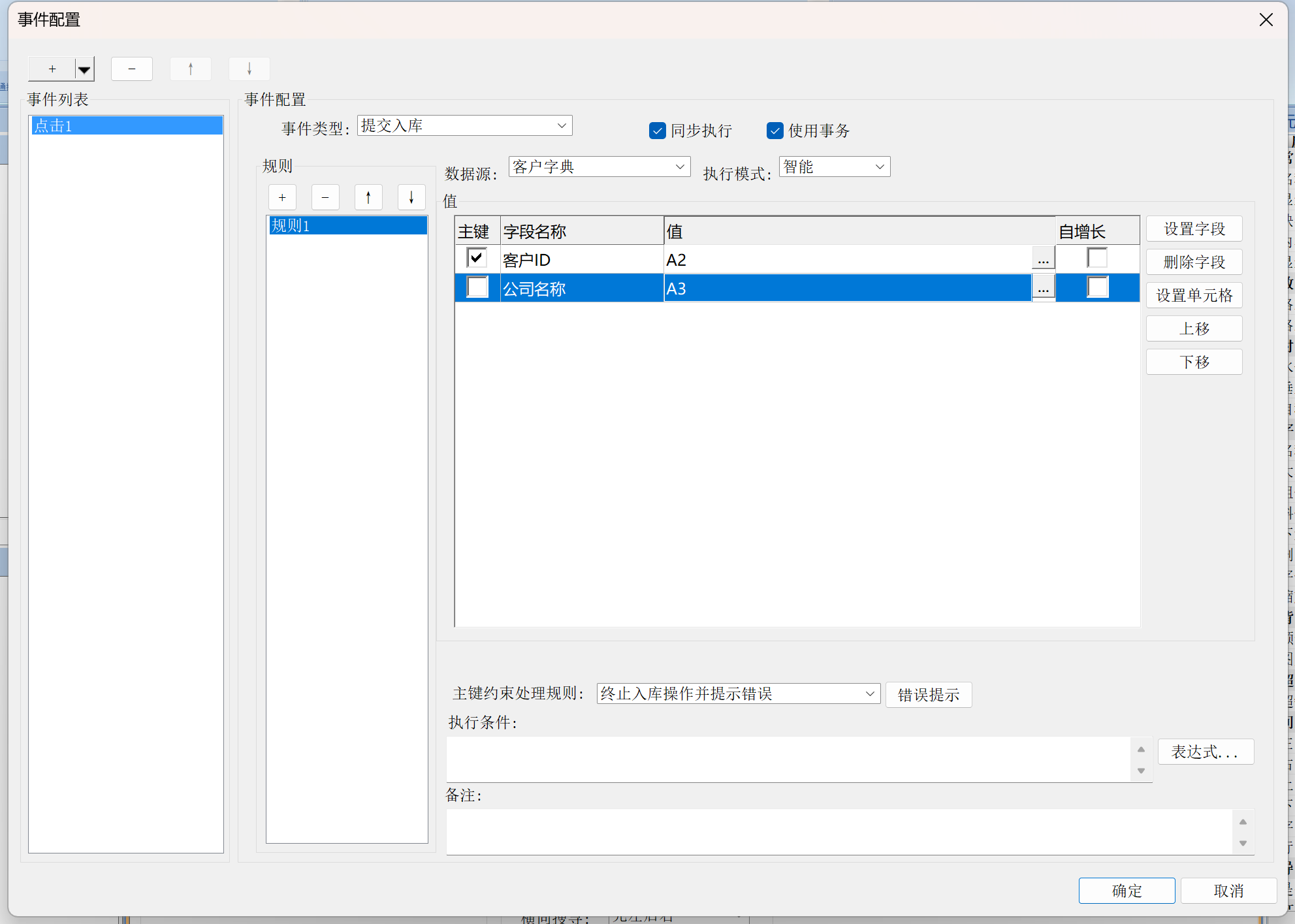 支持设置回写事件,实现数据的新增,修改,删除等处理(回写规则的设置详细介绍参见低代码开发平台文档[单元格表单-填报提交-回写规则]章节),如下图: