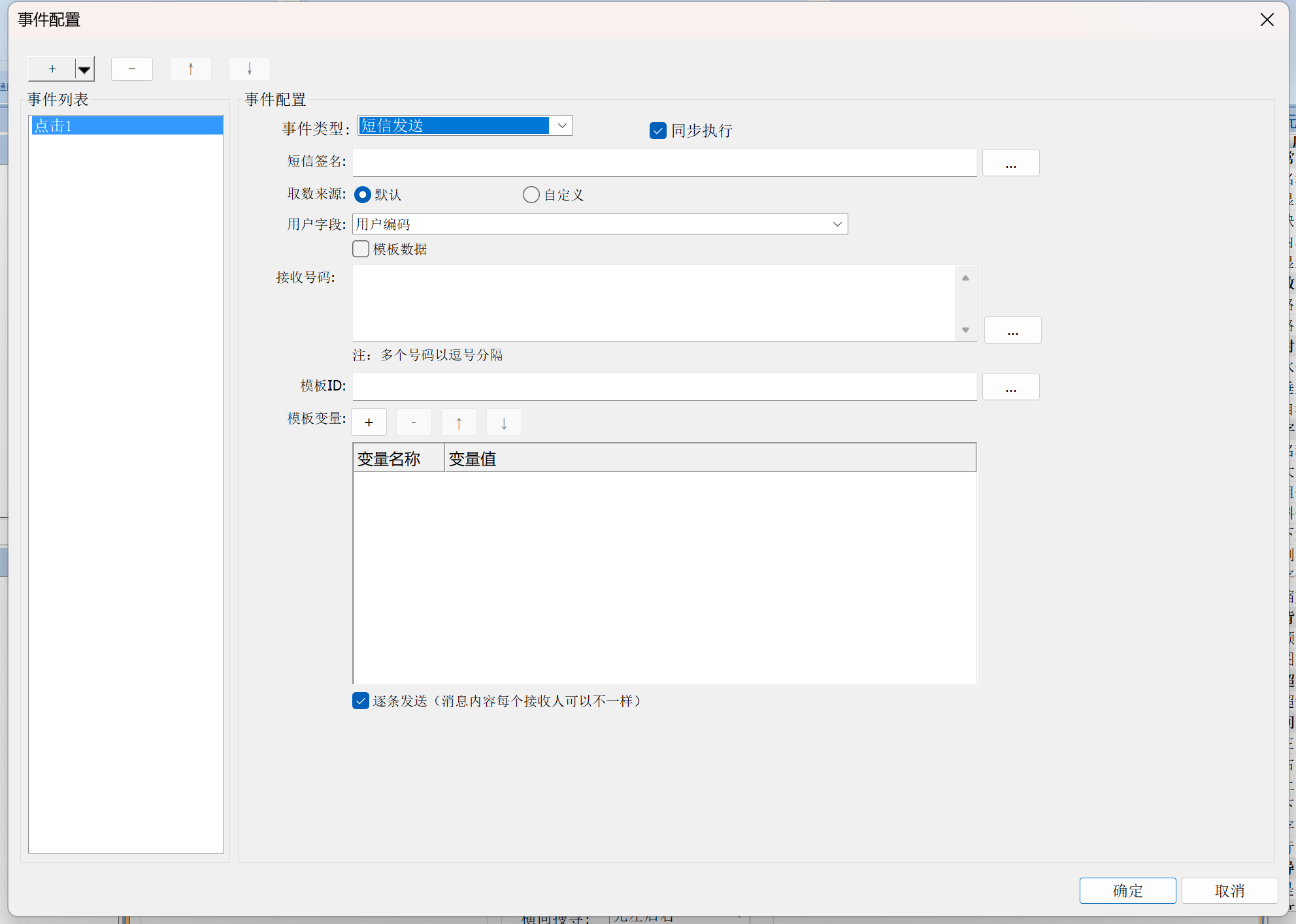 支持选择配置的短信签名、接收号码、模版id及模版变量。