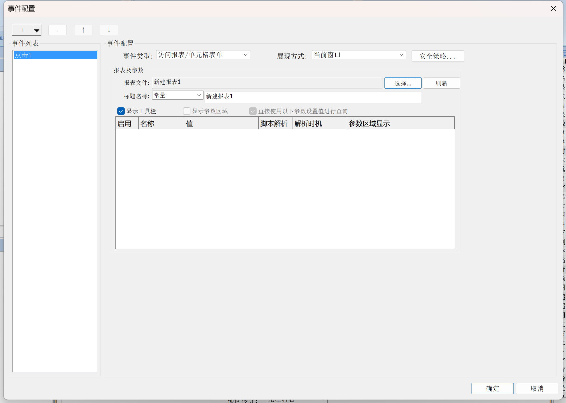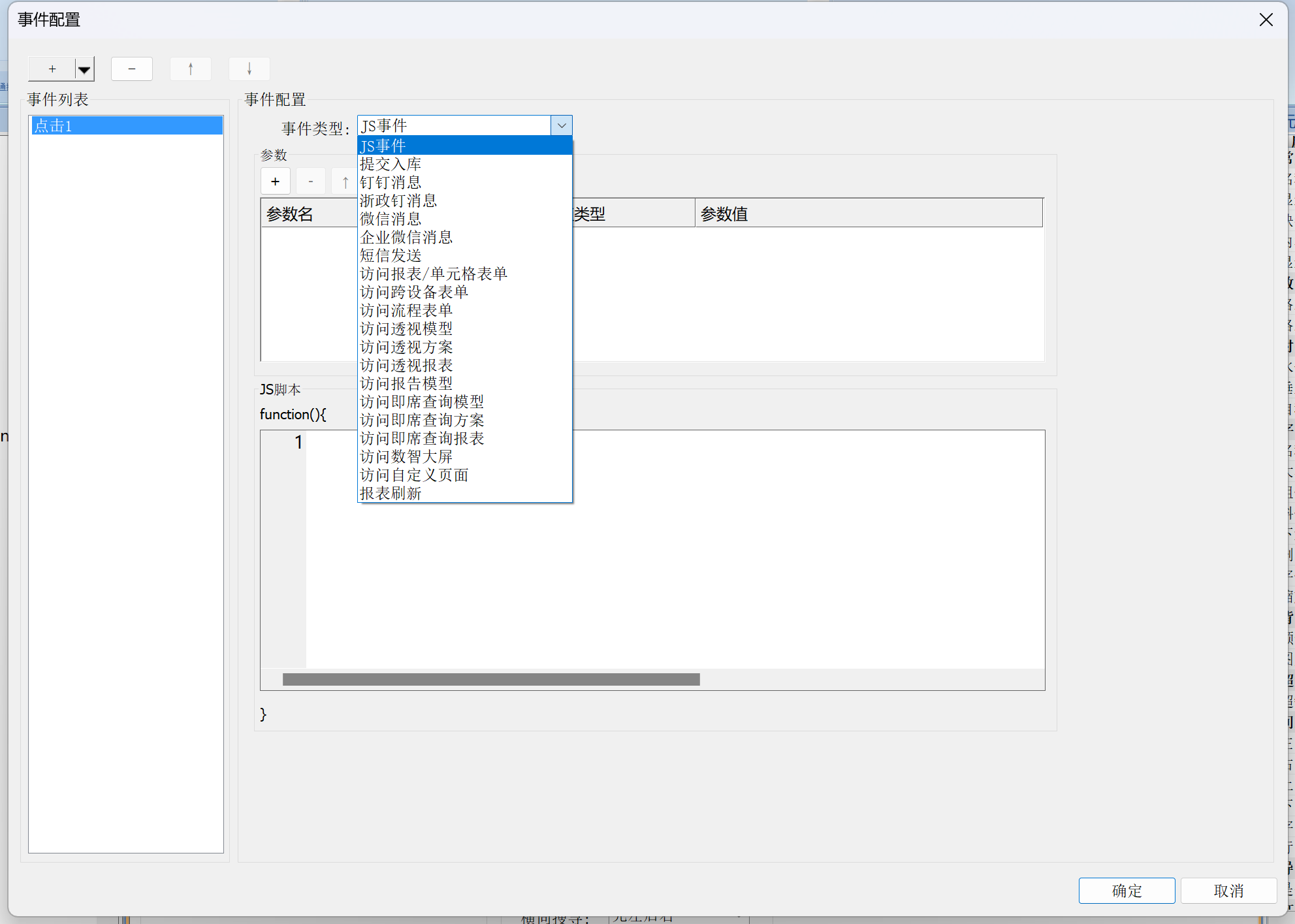 按钮事件类型类型包括: JS事件、提交入库、钉钉消息、浙政钉消息、微信消息、企业微信消息、短信发送、访问报表/单元格表单、访问跨设备表单、访问流程表单、访问透视模型、访问透视方案、访问透视报表、访问报告模型、访问即席查询模型、访问即席查询方案、访问即席查询报表、访问数智大屏、访问自定义页面、报表刷新。如下图: