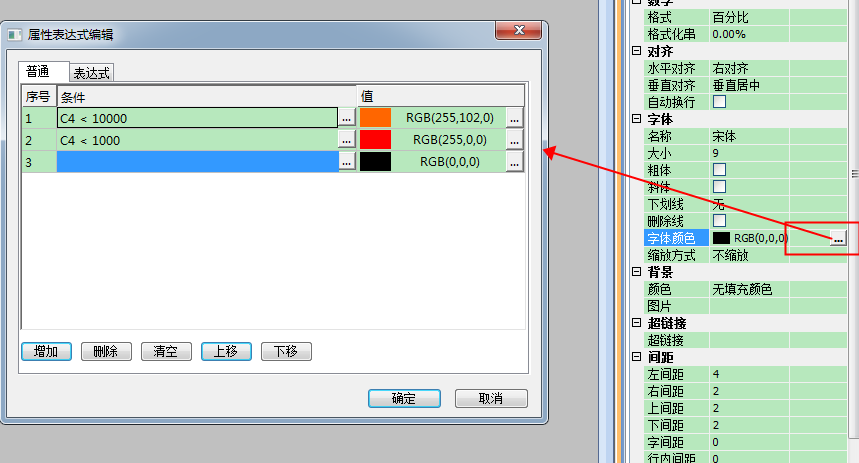在一些特定业务场景下(如:数据告警等),可以通过单元格属性栏中的表达式动态改变对应属性值,以字体颜色为例:
