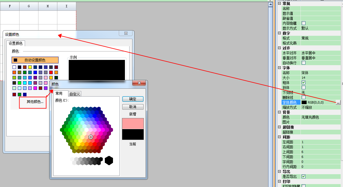 当需要设计与系统自带风格不一样的报表风格时,设计器可通过单元格属性中的对应控件进行设置,以字体颜色为例: