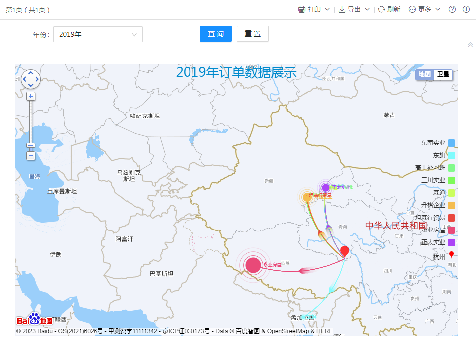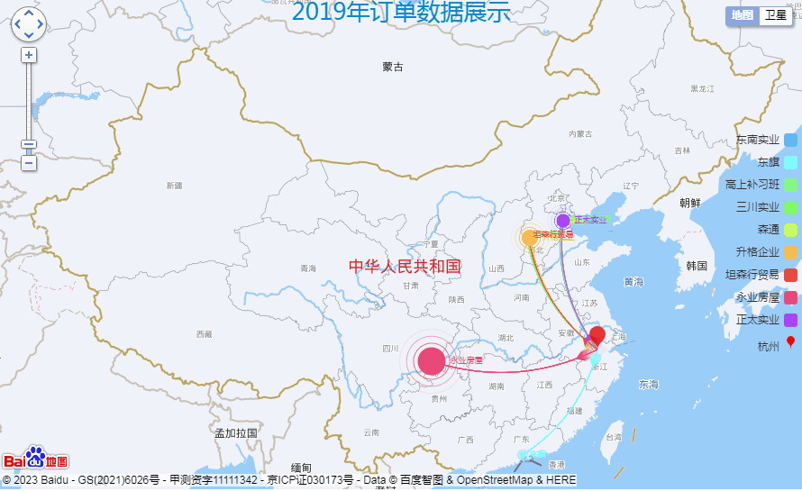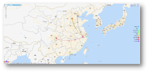 百度地图通过传入的经度值和纬度值可以精确的显示位置情况,加上流向图和气泡图,在展示区域流向的同时以特效散点的形式展示各区域的数值大小。
