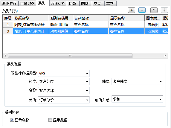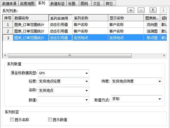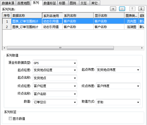 由于实际业务中需要以流向图展示订单流向,以散点展示各公司订单总额大小,因此,系列中设置两个系列。