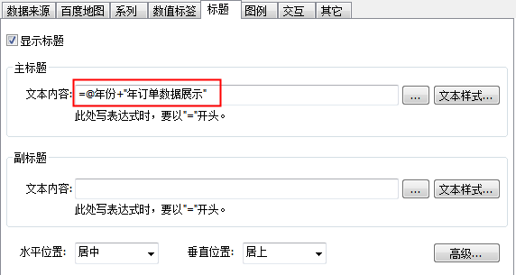 设置图表主标题为“=@年份+”年订单数据展示””,如下图: