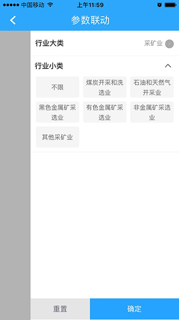 参数联动,就是指后面一个参数下拉框的值会根据前一个参数的值的改变而改变。 如下图中,行业小类选项会跟随行业大类选项而相应变动。