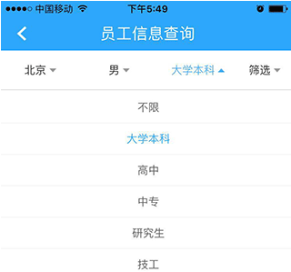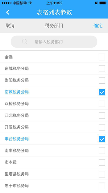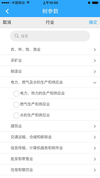 树仅支持“列表”展示方式,列表方式是以树型图的方式展示具有层级关系的数据,支持搜索功能,点击树控件弹出整屏的树选择界面,如下图: