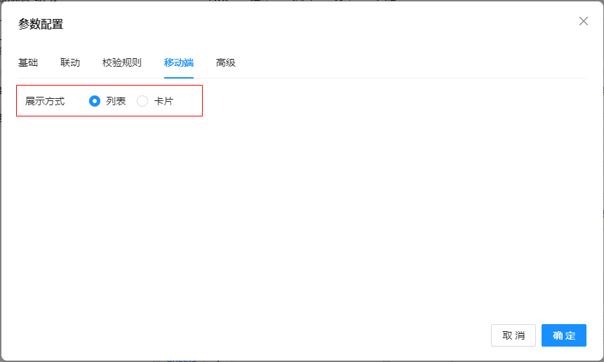 下拉框支持两种展示方式:列表和卡片。在参数配置的“移动端”tab中可配置,如下图: