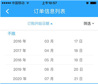 日期的展示方式与下拉框的列表方式类似,只是日期控件中的显示内容是根据设计器中配置的日期格式进行显示的,不支持秒,如果设置的日期格式为“yyyy-MM-dd”,则日期控件中出现三列:年、月、日,如下图: