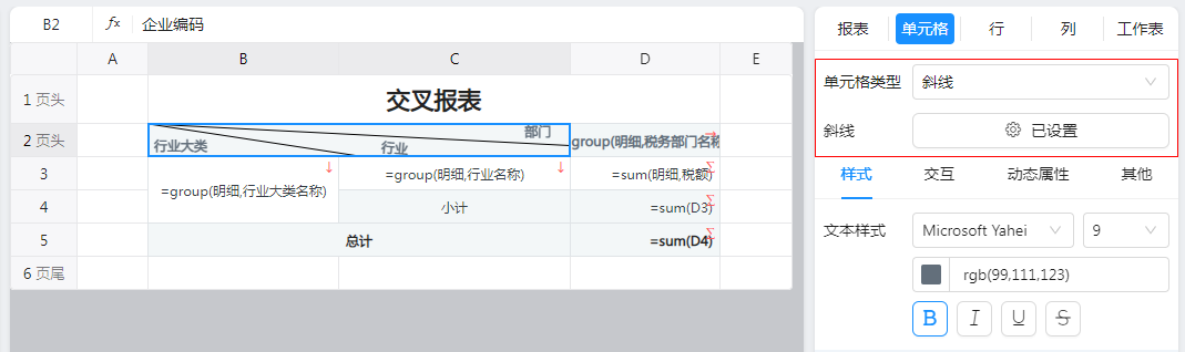 想要实现交叉报表的效果,标题头必须使用斜线单元格,通过右侧属性区将单元格类型设置为“斜线单元格”,并进行斜线设置即可。