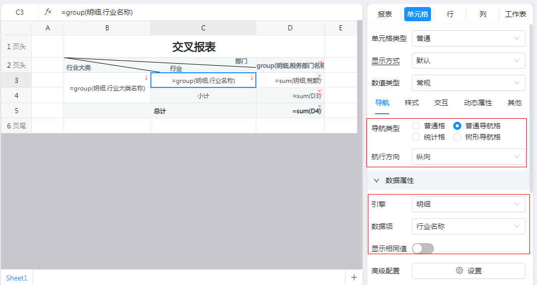 将单元格B3和C3均设置为“普通导航格”,航行方向为“纵向”,其中B3用于行业的分组显示,分组功能可参考文档:分组报表。