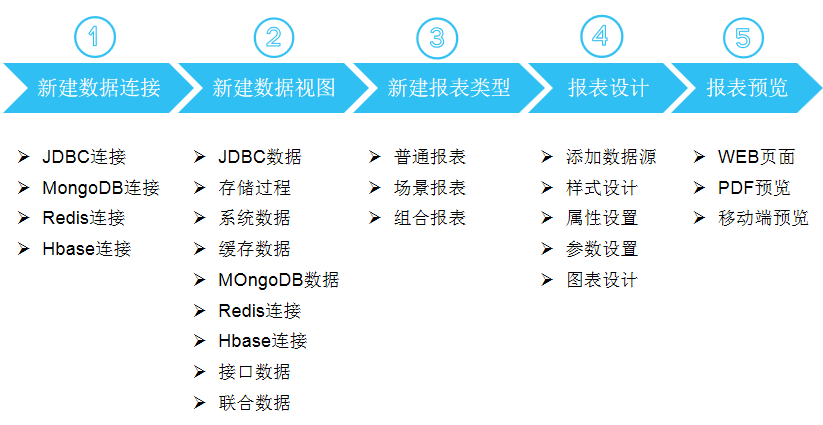 lczReport 可以实现表格设计、数据查询与过滤、可视化图表等多种功能。快速入门学习路径通过使用简单的入门示例,使用户对报表设计流程以及报表主要功能进行简单的了解和学习,报表的整体设计流程如下图所示: