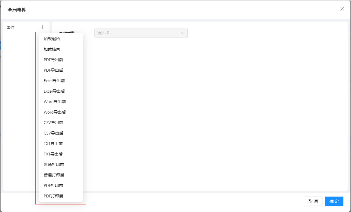 点击[事件]进入事件配置界面,点击“+”选择事件触发时机,普通报表支持的时机如下: