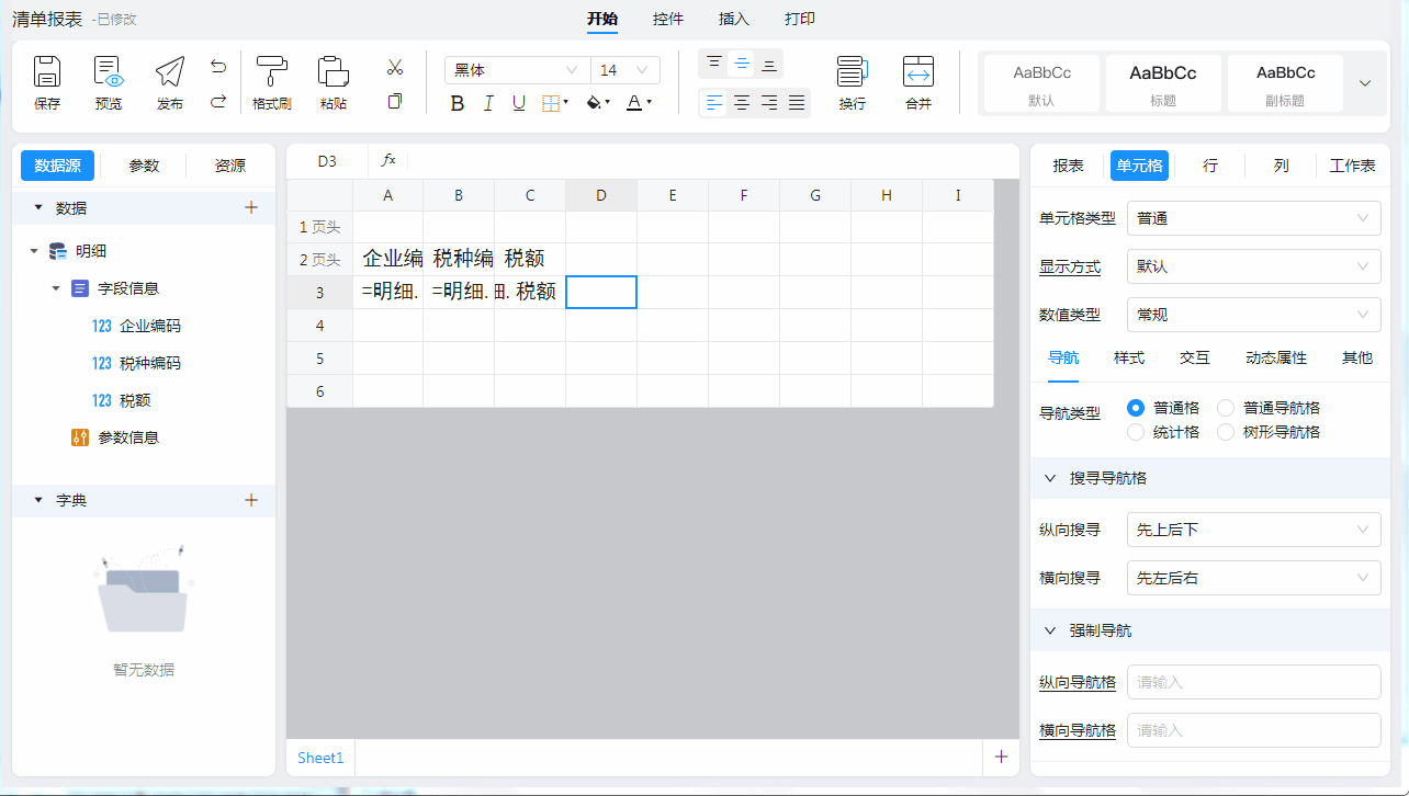 2)第二个变化是,A3单元格的内容由原先的“=明细,企业编码”变成了“=select(明细,企业编码)”。您可以不用管这个表达式如何编写,因为,一般情况下您不需要手动去修改这个表达式。