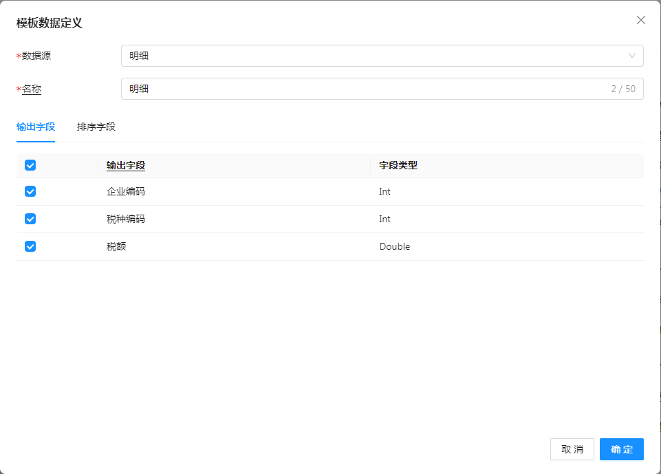 点击“+”进入模板数据定义界面,选择定义好的数据源“明细”,选择需要输出的字段以及排序字段,如下图: