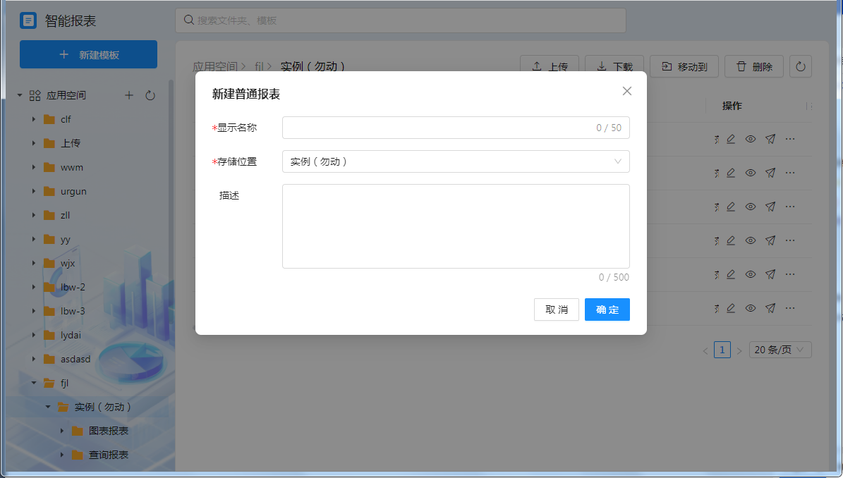 通过设计中心的“模板中心”进入模板管理界面,点击”新建模板”或下方“应用空间”中的目录上的“+”按钮,选择“普通报表”类型输入报表名称和存储位置即可快速新建一张空白的 [普通报表] 。
