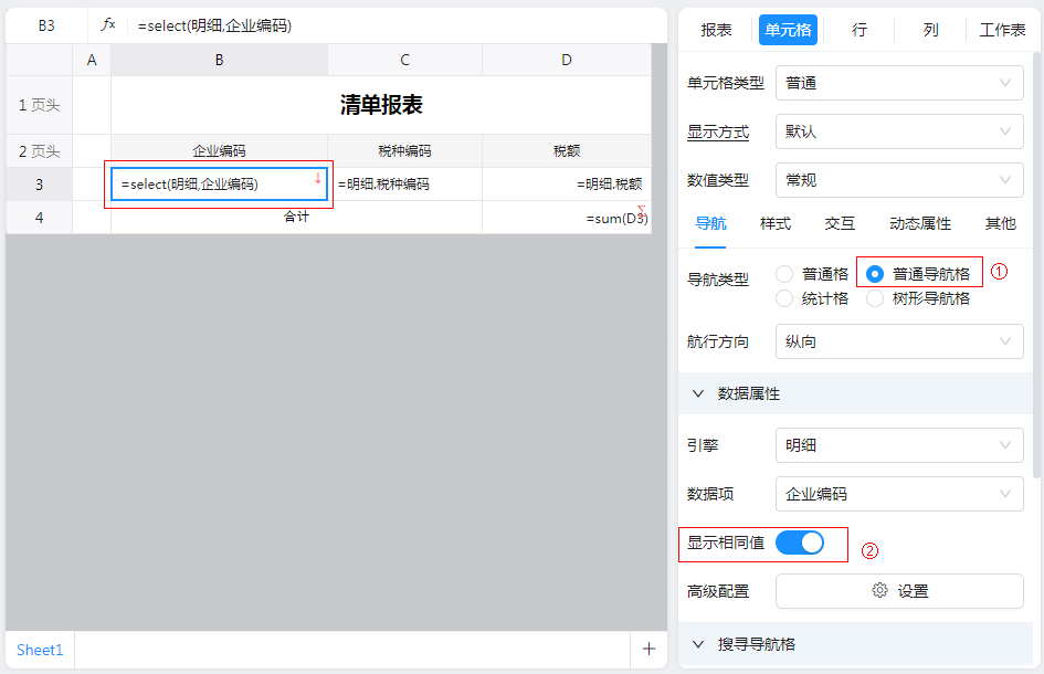 1) B3 设置为导航格,并勾选“显示相同值”;