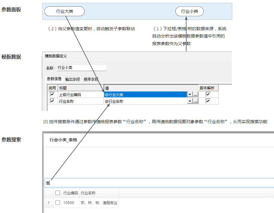 同样以“行业大类”和“行业小类”参数联动为例,“行业小类”选项跟随”行业大类”所选值进行联动变化,如下图: