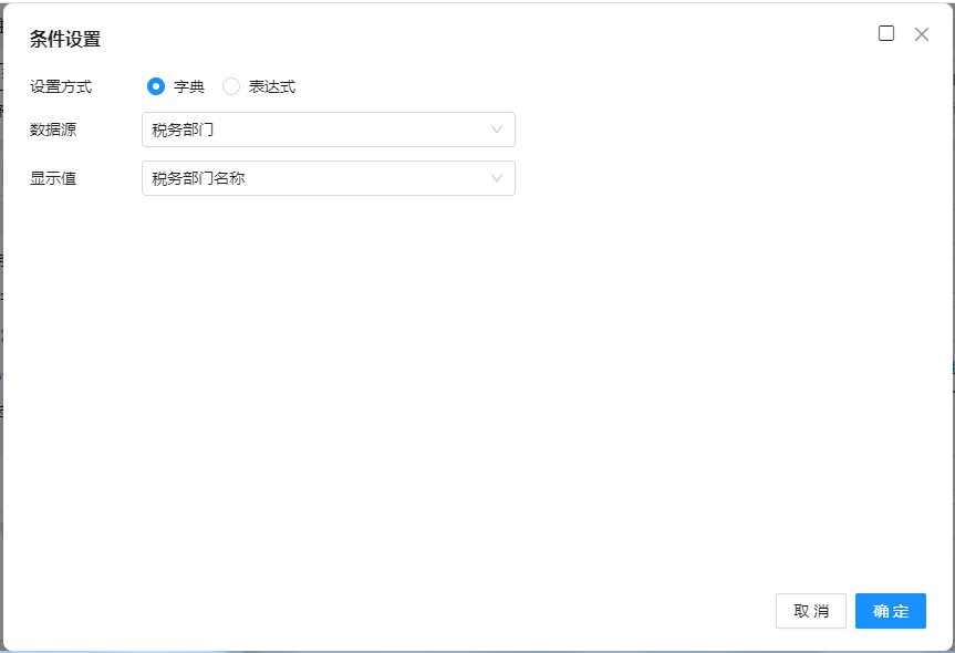 B6单元格是税务部门编号,但是显示的时候想按照税务部门名称进行显示,那该单元格的“显示值”需要使用动态属性进行设置,条件使用表达式“”税务部门.税务部门名称”即可。