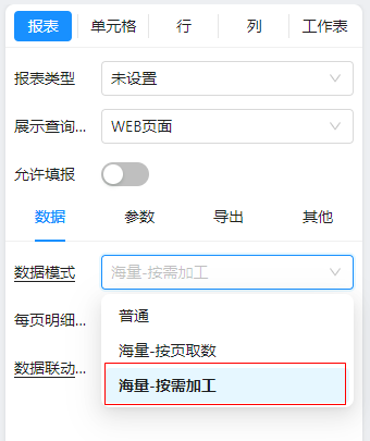 配置比较简单,打开制作的报表,只需要将报表属性中的“数据模式”配置为“海量-按需加工”即可,如下图:
