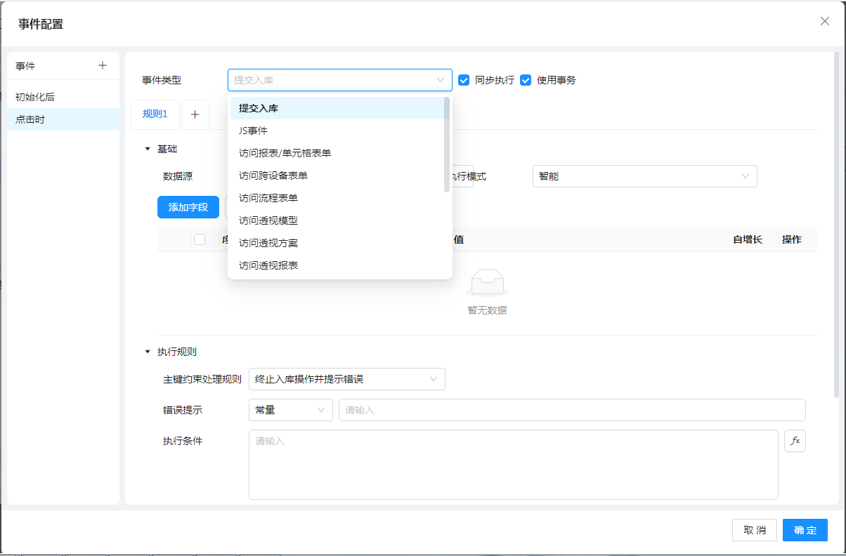 自定义按钮支持“事件配置”,点击可进行“初始化”和“点击”事件配置,其中“点击”事件支持的事件类型包括提交入库、JS事件、链接跳转等,如下图: