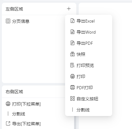 部分按钮支持个性化设置,添加到左侧或右侧区域的按钮选中后,右侧将显示对应的配置项,比如添加“导出Excel”按钮并为其进行设置,如下图: