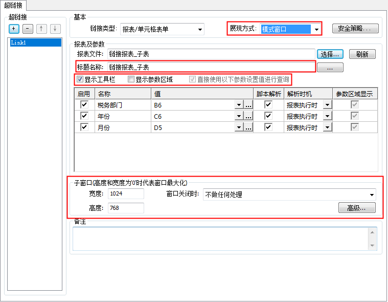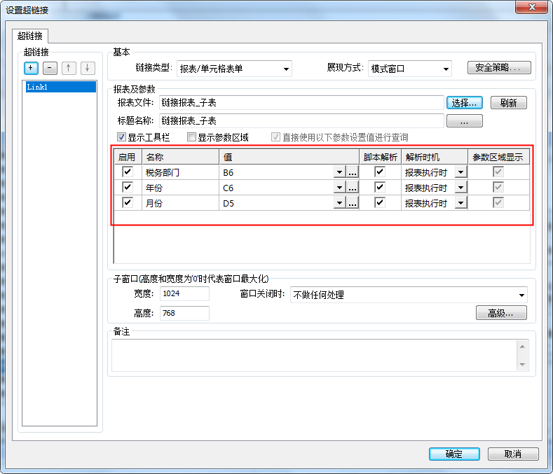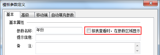(1)在链接配置窗体中列出的链接目标模板的参数中,包括了目标模板的“非参数变量”。所谓“非参数变量”,是一种叫法,其实也可以叫做“被隐藏的参数”,是因为模板模板在定义这些参数的时候没有勾选“报表查看时,在参数区域显示”: