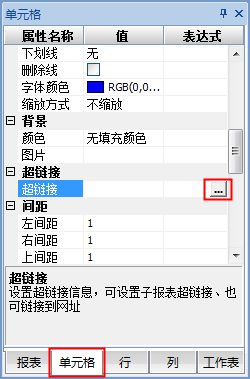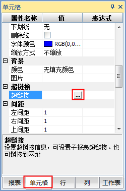 那如何配置选择呢?在单元格的属性页中的“超链接”属性中进行配置,如下图: