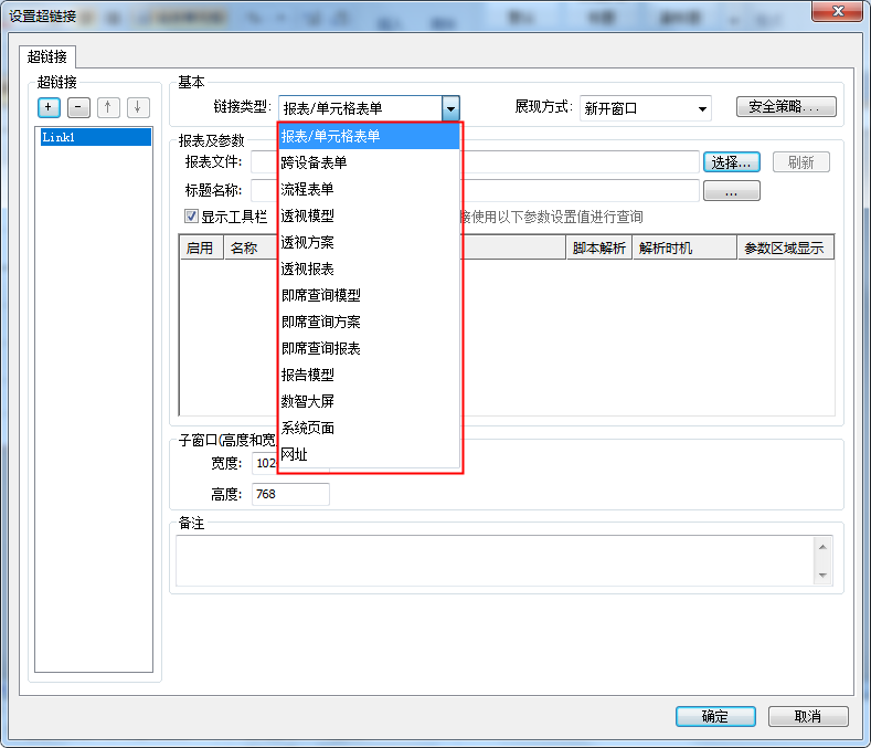 超链接支持报表/单元格表单、跨设备表单、流程表单、透视分模型等10几种链接类型,可以是不同类型的模板,也可以是系统页面,还能链接到某个网址。如下图: